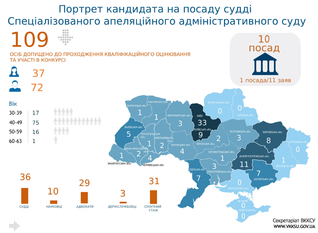 - з 8 кандидатами співбесіди відбудуться у пленарному складі Комісії (у Київському апеляційному суді – 2, Одеському апеляційному суді – 5, Харківському апеляційному суді – 1).